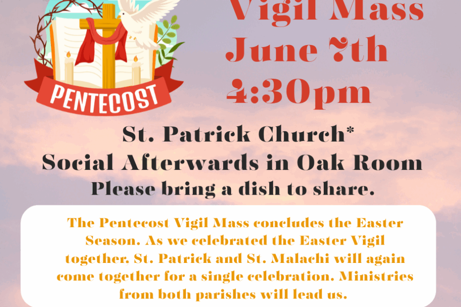 Please note that there is one combined Vigil Mass this weekend and it will be held at 4:30pm at St. Patrick to celebrate the Pentecost Vigil, a… Read More »Special Pentecost Vigil Mass